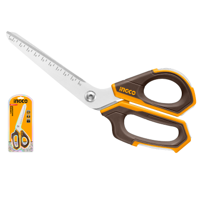 The construction scissors include a serrated cutting edge for increased force and grip